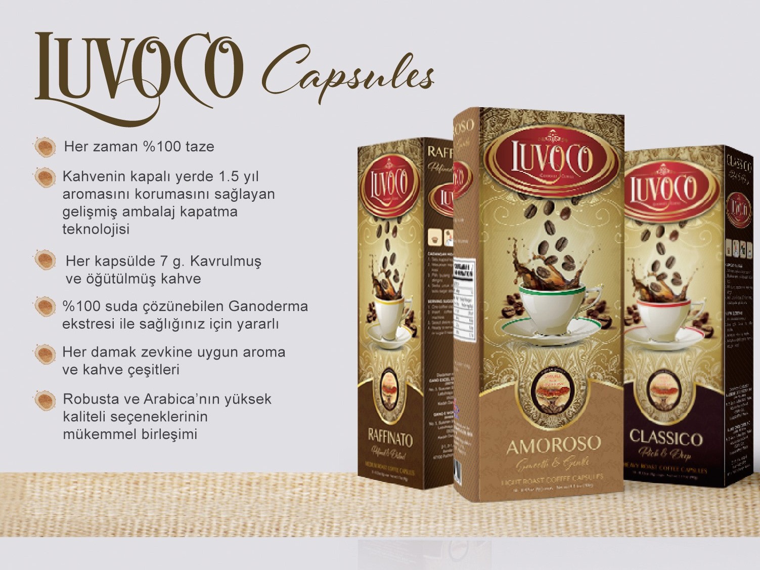 LUVOCO %100 suda çözünebilen Ganoderma ekstresi içeren daha sağlıklı gurme kahveyi sunar. Kahvenin Ganoderma’nın faydalarıyla birleşmesiyle birlikte, artık kahve içmek için çok daha fazla sebebiniz var! Luvoco gurme kapsül kahve yalnızca kendi makinesinde kullanılabilir.